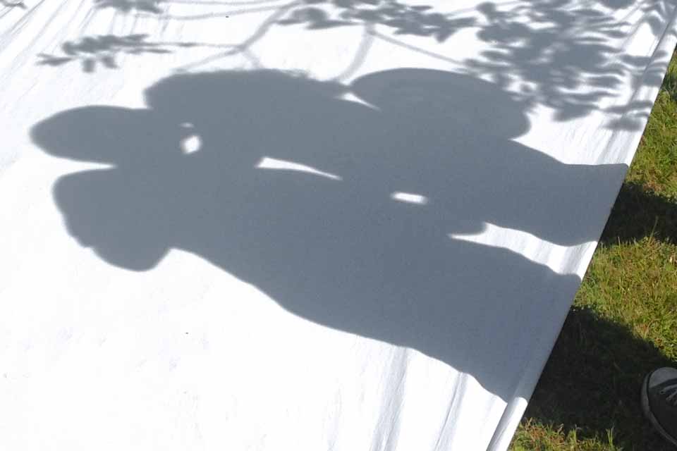 ,»Liebe Liebe III« Bei meiner Idee zur Laubenland-Aktion beziehe ich mich auf eine Arbeit, die ich 1996 im Außenbereich gemacht habe – auf einer Brandwand und einer Kaimauer in Lauenburg/Elbe. Es war eine zweiteilige Wandarbeit, großformatige Plakatierung, weiße Punkte auf schwarzem Grund. Die Punkte folgen dem Braille-Raster und bilden die Wörter LIEBE LIEBE. Im Heimgartenbund Altona konnte ich LIEBE LIEBE III realisieren. Auf einer Rasenfläche habe ich einfache Stöcke senkrecht in den Boden gerammt. Auch hier folgt die Anordnung der Stöcke dem Braille-Raster. Direkt daneben habe ich ein altes weißes Betttuch am Boden verspannt. Bei allerbestem Sommerwetter bot sich den Betrachtern zwischen dem Stockschriftfeld und dem Laken stehend ein eigentümliches Bild: vorne rätselten sie über die Bedeutung des Stockrasters, hinter ihnen bildeten sie selber ein etwas weniger rätselhaftes, in einigen Fällen den Braille-Text illustrierendes Schattenbild.